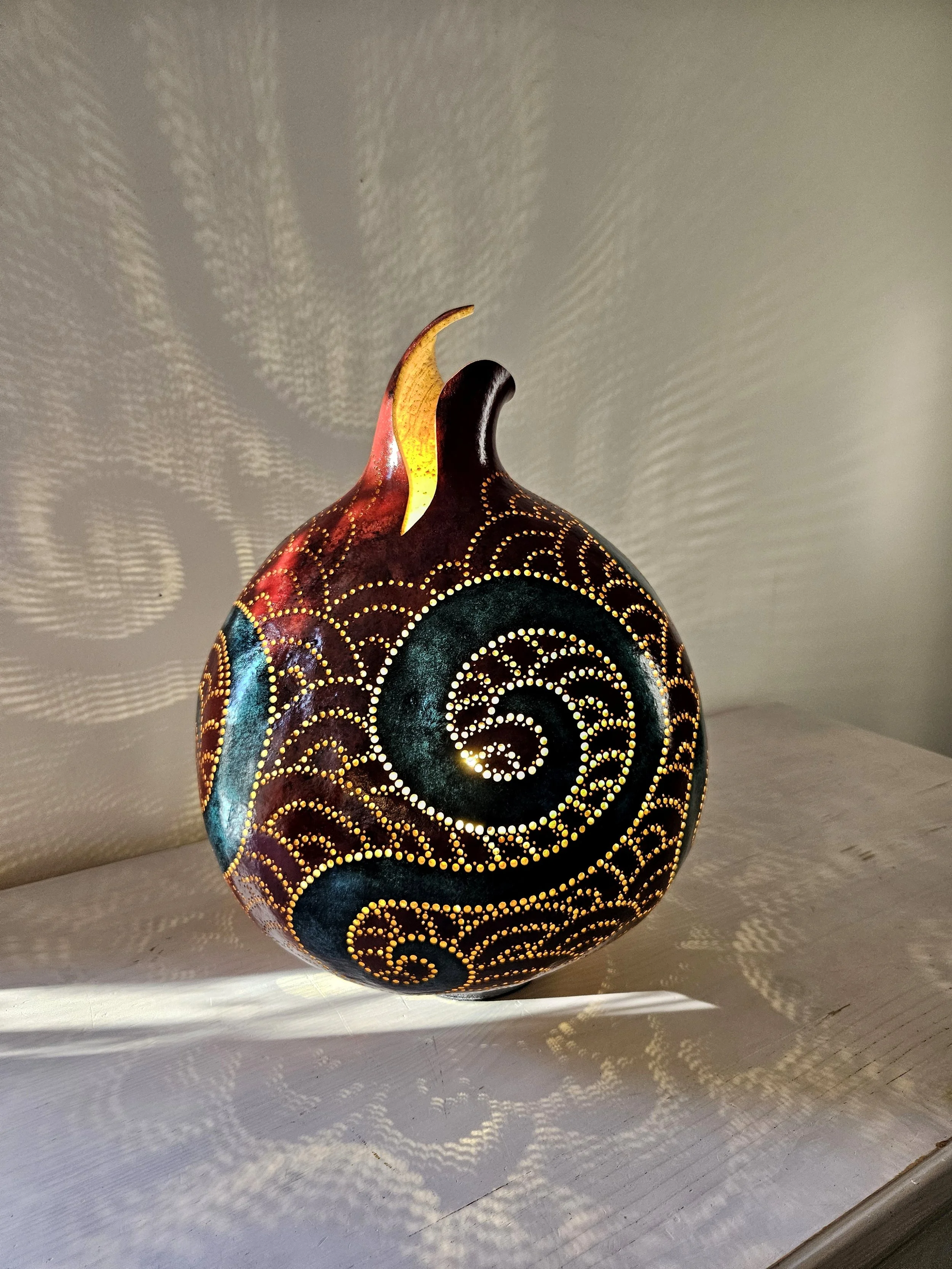 Starting with a naturally grown gourd I gradually transform it, using engraving and drilling, following its own unique curves. I finish it by bringing the patterns to life with vibrant colors.